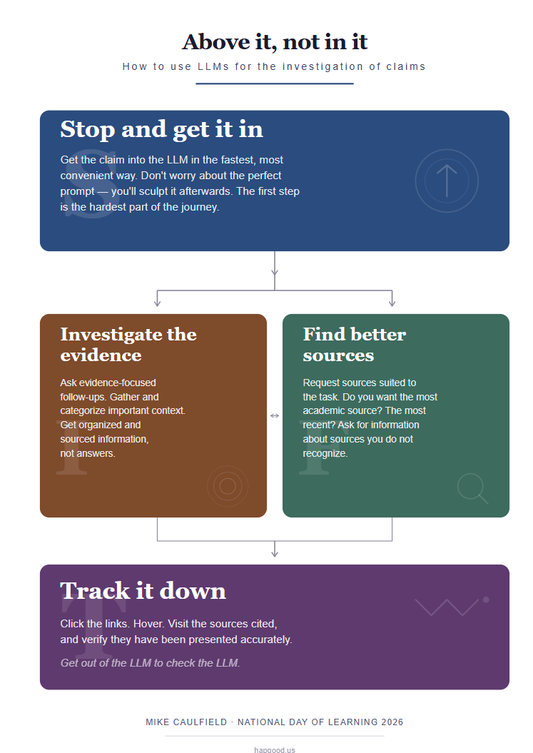 The proposal is therefore to split the actions within an LLM-search hybrid system into two: a claim-focused activity, where follow-ups collect and organize knowledge about the claim, and a source-focused move where effort goes toward finding more suitable sources and learning more about them. In my vision, the student often does a bit of both before a Track it Down move where they verify that whatever they’re seeing sourced is represented correctly by the hybrid interface or the sharing source.
