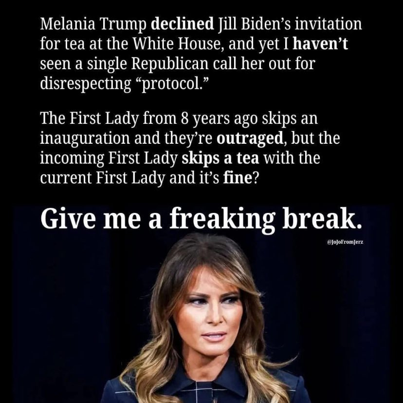 There is a double standard in how breaches of protocol are judged, as Michelle Obama's absence from President Trump's inauguration sparked outrage, while Melania Trump's declining Jill Biden's tea invitation did not.