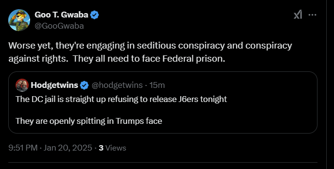 The DC jail's refusal to release the pardoned January 6 individuals (J6ers) constitutes participation in seditious conspiracy and conspiracy against rights, warranting federal prison sentences for the involved parties.