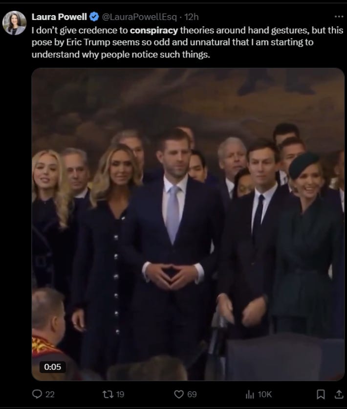 Eric Trump's hand gesture appears unusual and may be a deliberate signal associated with conspiracy theories.