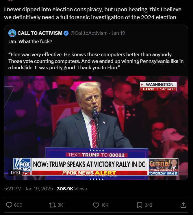 Moderate Support: The claim that a forensic investigation is warranted gains some traction from the unusual nature of Trump’s comments, which raise questions about transparency and Musk’s alleged role. However, the lack of corroborating evidence or additional context weakens the argument. The statement alone, without clear proof of misconduct or irregularities, does not necessarily justify a full investigation. Further details about Musk’s actual involvement (if any) would be critical to substantiate the claim and determine its seriousness.