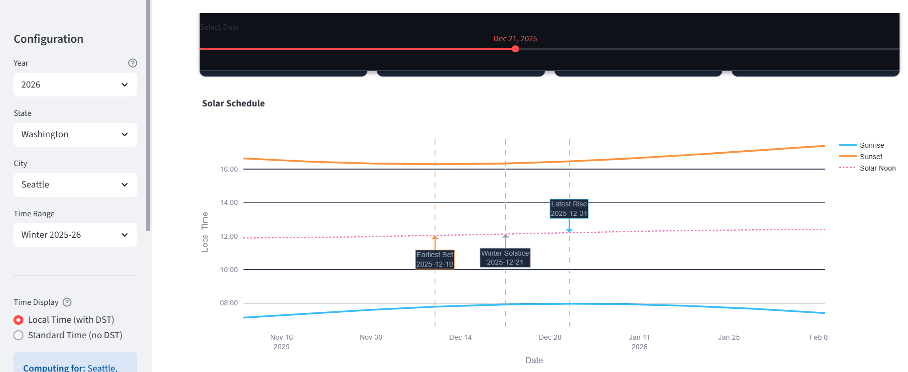 I was doing one of my little fact-checking walkthroughs the other day on an interesting fact that came into my feed: the earliest sunset in Seattle is tomorrow, December 10th.