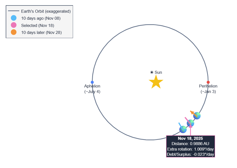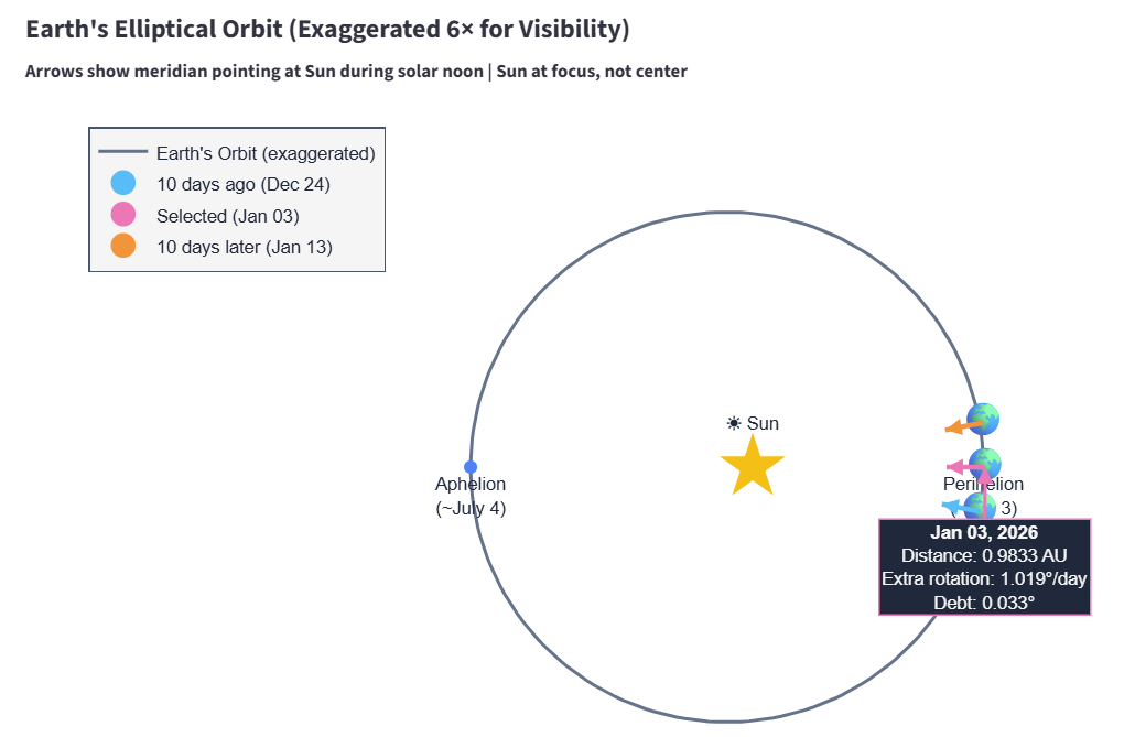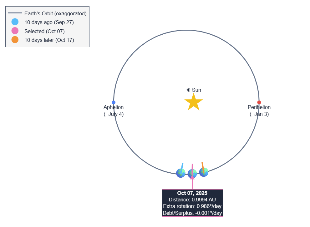 I ask Claude to make me a diagram of the Earth’s orbit with the date that we go the fastest marked and the date we go the slowest. Then allow me to set any date and see the extra rotation we would need
