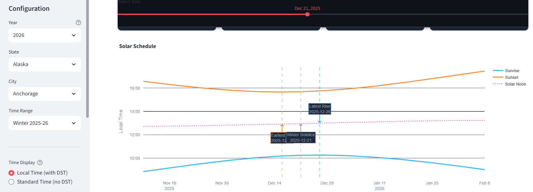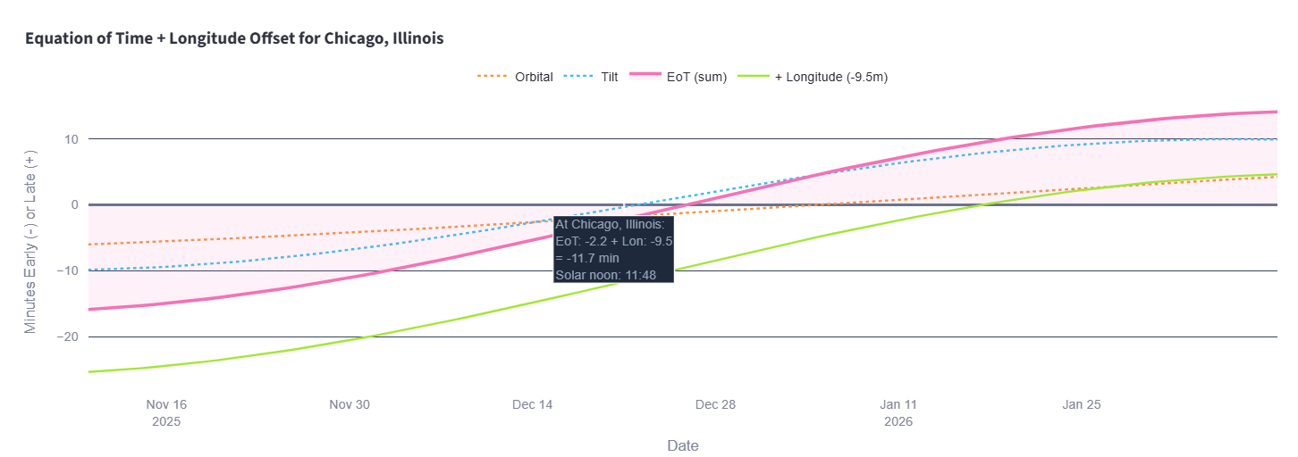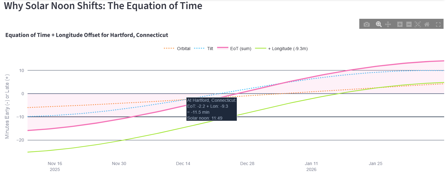 So each day the debt begins to accumulate. Let’s find the beginning and end of the shift of solar noon forward on our chart. I ask Claude code to add some min/max labels and let me hide lines. This one’s a bit of a mess because Claude tells me it’s actually hard to make the labels disappear when I disappear the lines because the graph is server generated, which I don’t quite get, but whatever. You can see the start and end dates of the growth, with Jan 3 in the middle of the upward trend: