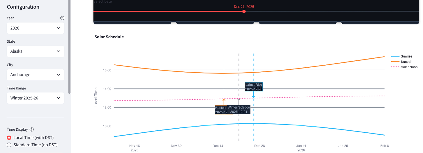 I started by just asking it to build a visualization of how for a given city how the solar noon shifts, and how that impacts earliest sunset and latest sunrise. Here’s one for San Francisco with its earliest sunset on December 6: