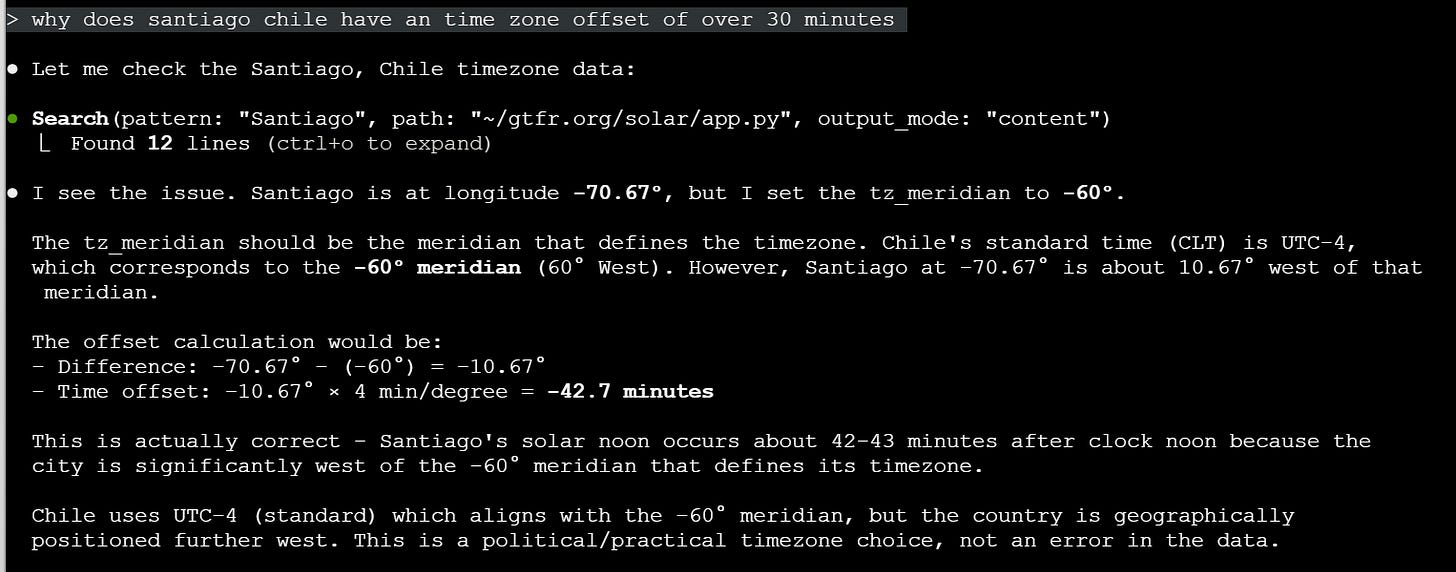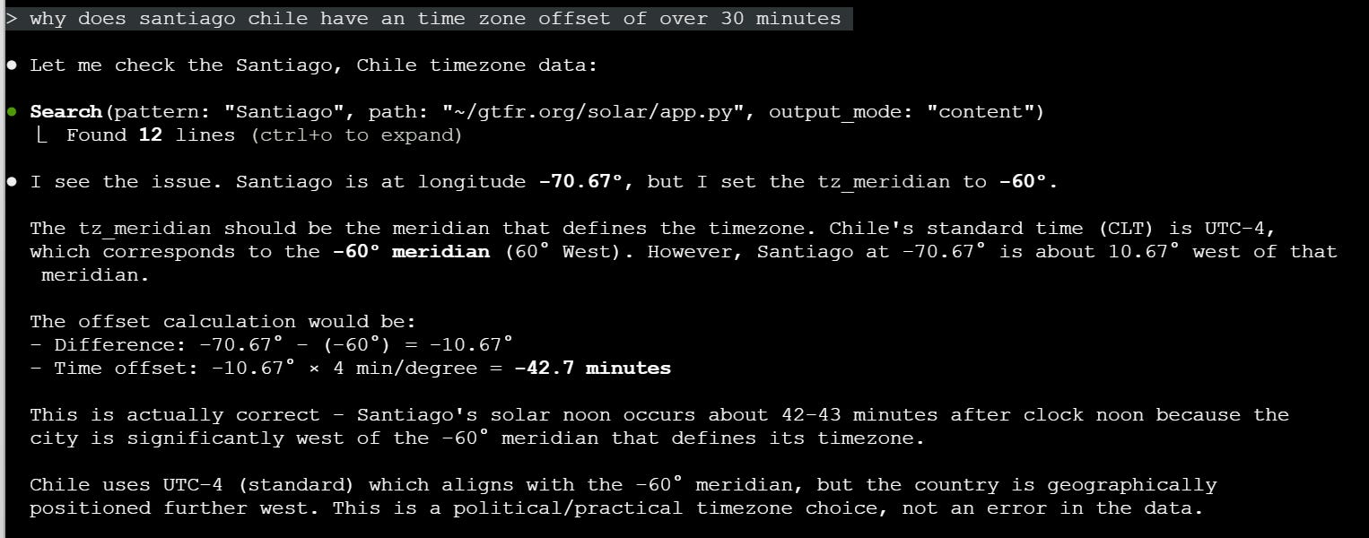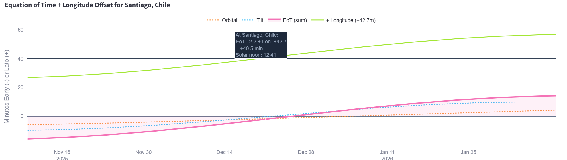 So if I understand this part right, this should be a global effect, whether it’s summer or winter where you are, the whole earth is speeding up or slowing down so it should be the same effect all over. I decide to test my understanding by telling Claude to put South American cities into the model and then checking Santiago, Chile: