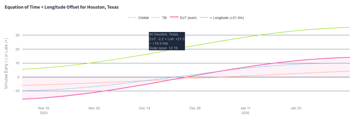 It’s below. So I’m reading the graph right, I just was misinterpreting the “+”. Dallas is “19 minutes” west of the time zone meridian, so even without the “space stuff” its solar noon is on average is going to be 19 minutes after clock noon in that zone.