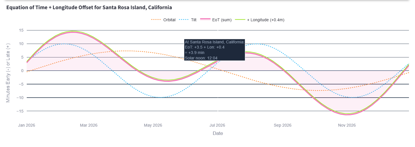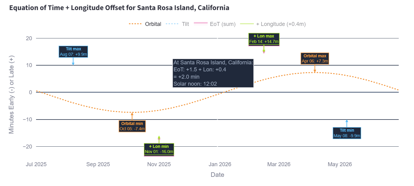 What does this solar noon drift look like across a year? I peek at Santa Rosa Island which happens to be on the Pacific Time meridian. And I kind of wish I hadn’t, because I don’t really understand this, but I can see that there is one trend that is annual (orbital as the orange dotted line, makes sense) and another that is bi-annual (axial tilt, blue dotted line, I have no idea why it has two peaks. Spring and fall maybe? Except it doesn’t peak in either.)