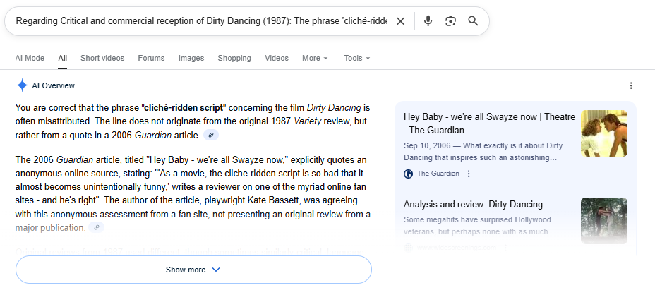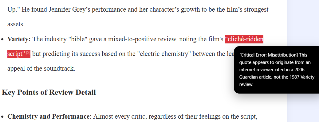 One problem I am still having is that Gemini Pro is going a little light on the errors. For example, other aspects of that “summary” of Variety are also made up, including the “electric chemistry” bit (which might just have been pulled as a general descriptor or might be from a Screen Rant review in 2022) and “the appeal of the soundtrack.” The Variety review is in fact just a three-paragraph note, which is indeed “mixed-to-positive” but says none of these things. It would be nice if the check could catch all of these.