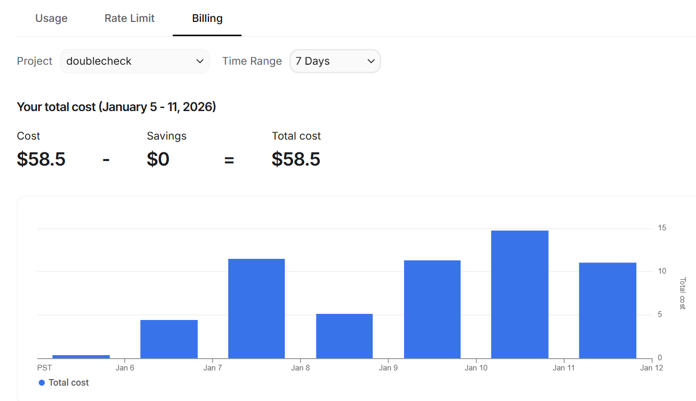 On the other hand, the Gemini responses are cheap. The billing API isn’t as real-time as Claude, so it will take a while to sort out costs, but I think this represents about 600 reports run, so close to a dime a page: