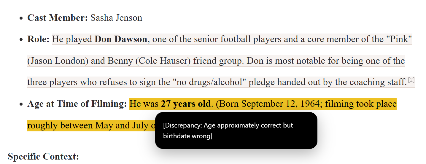 I ask a question of an LLM like “who was the oldest member of the Dazed and Confused cast”, and get a response. I then have Claude Sonnet or Opus 4.5 go through each sentence and check it. It’s pretty cool. Here, for example, it notes a problem with the yellow-highlighted line: