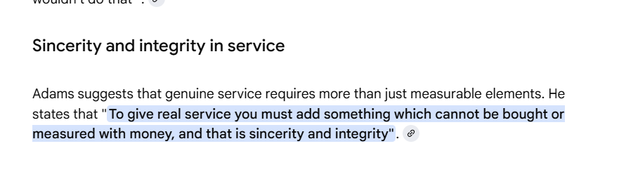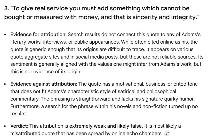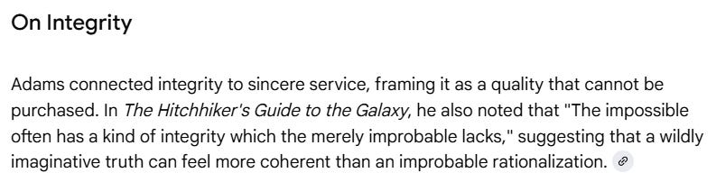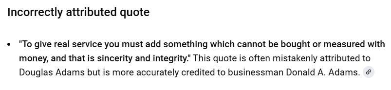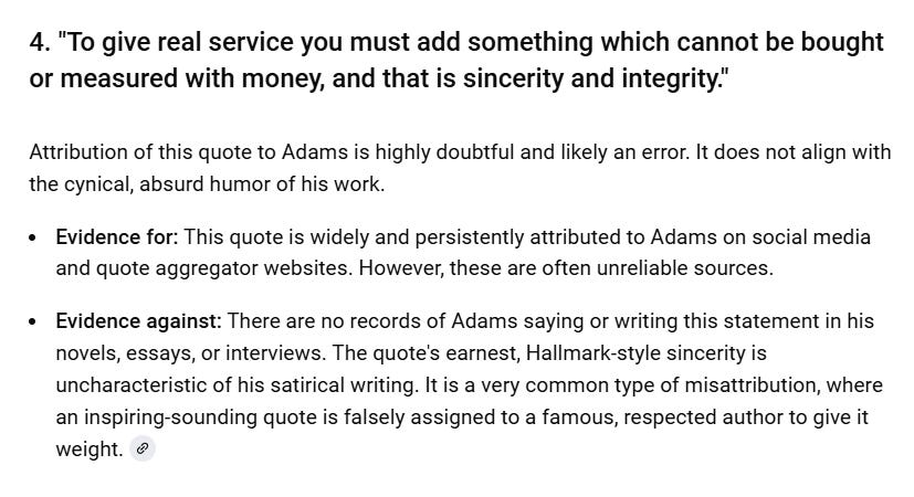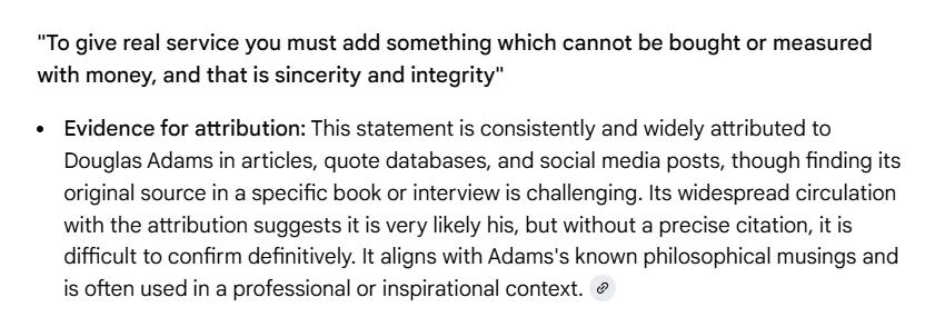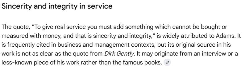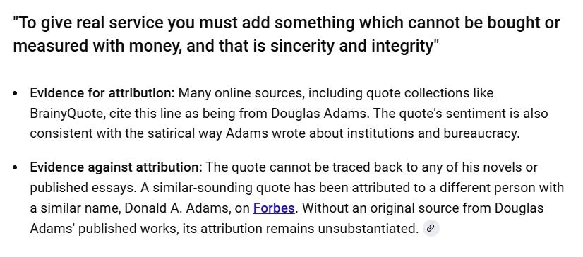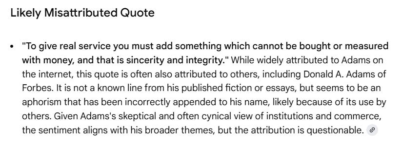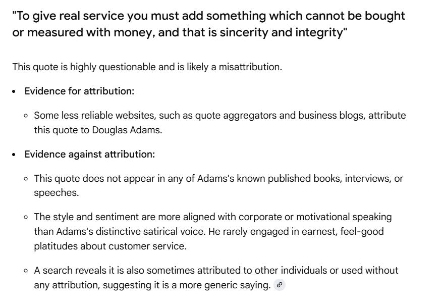 Here’s our challenge. I discovered last week that when we ask AI Mode for quotes on honesty from Douglas Adams, author of Hitchhiker’s Guide to the Galaxy, we will often see a specific bad quote in there: