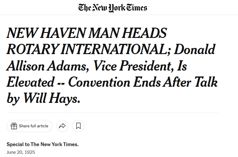 That Adams is known not for writing novels and radio plays, but for rising to the presidency of Rotary International in June of 1925: