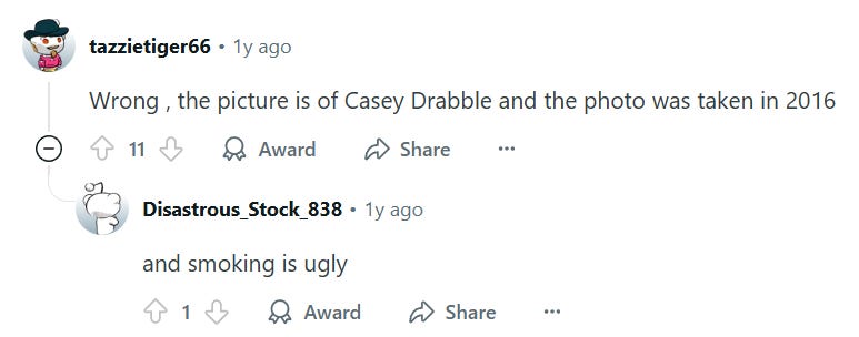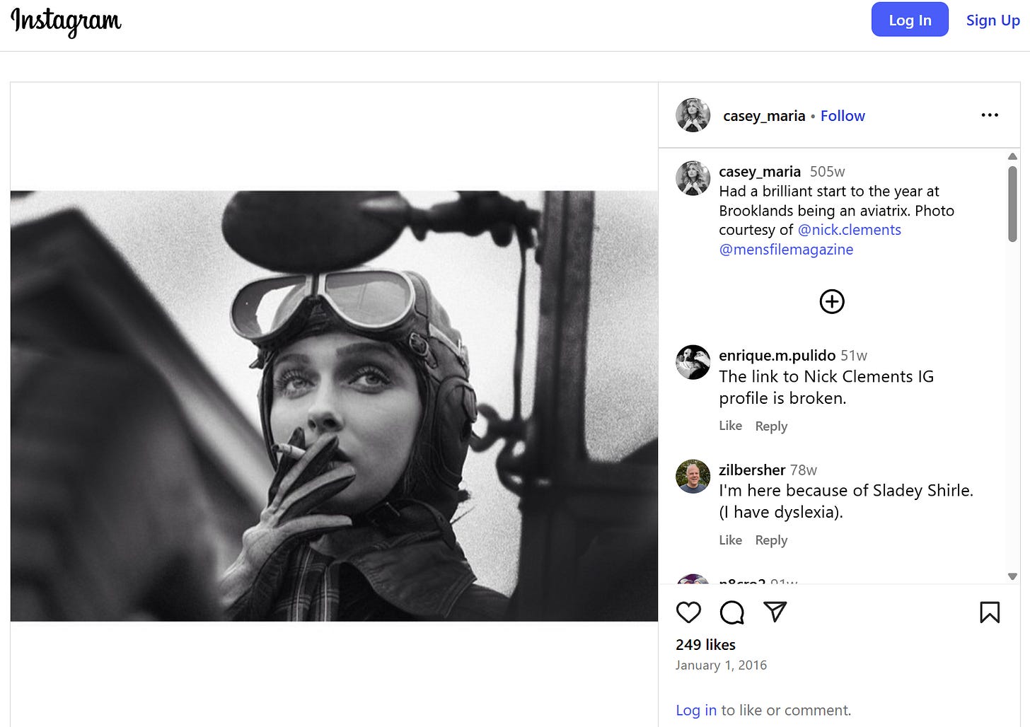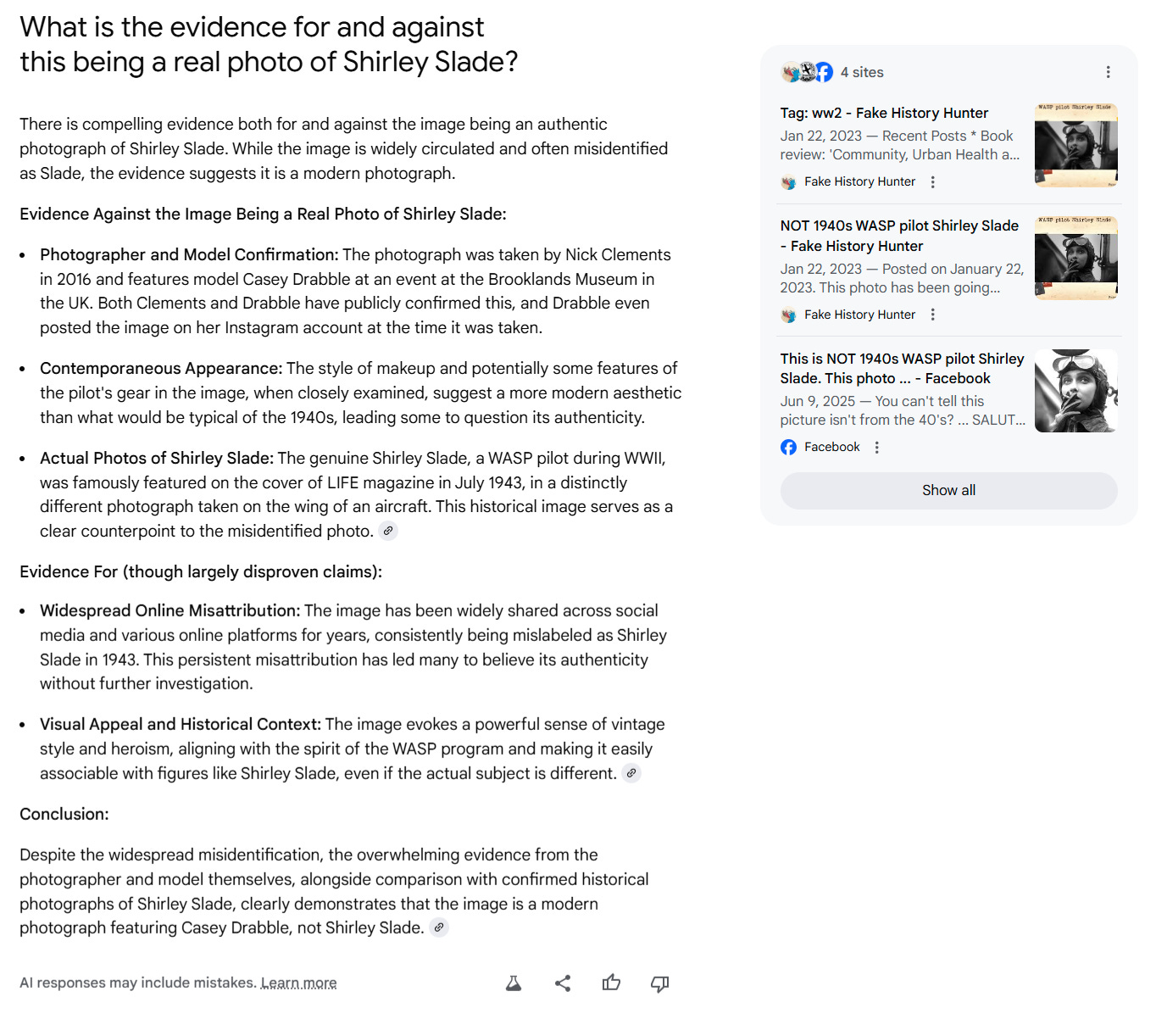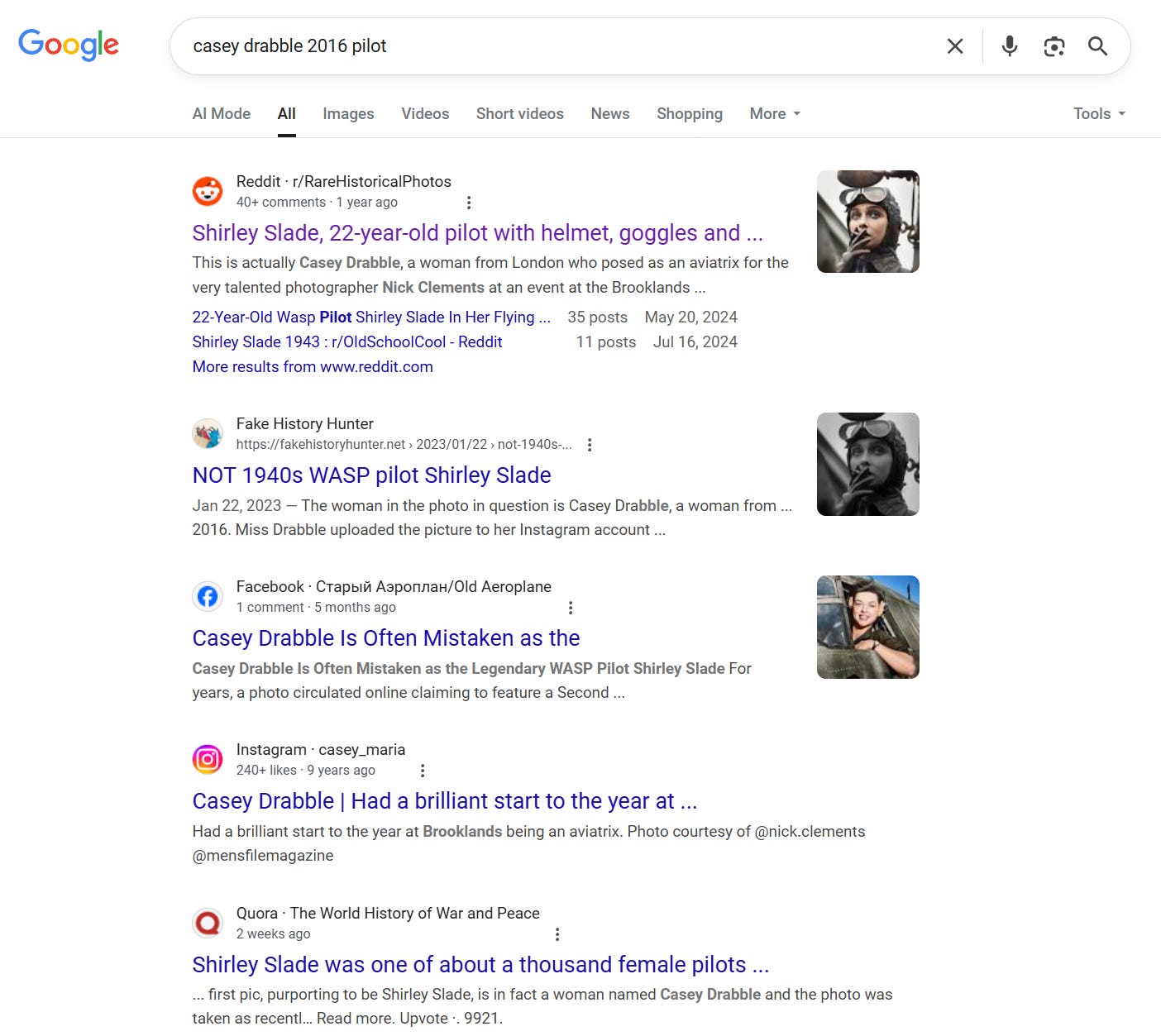 With this second pass, everything reveals itself. We’ve got a great Fake History Hunter post fact-checking it. We have a link to photos of the real Shirley Slade, who looks completely different. We even have an Instagram post by Casey Drabble herself, posting the photo from her shoot, standing in the place where this saga began exactly five hundred and five weeks ago:2