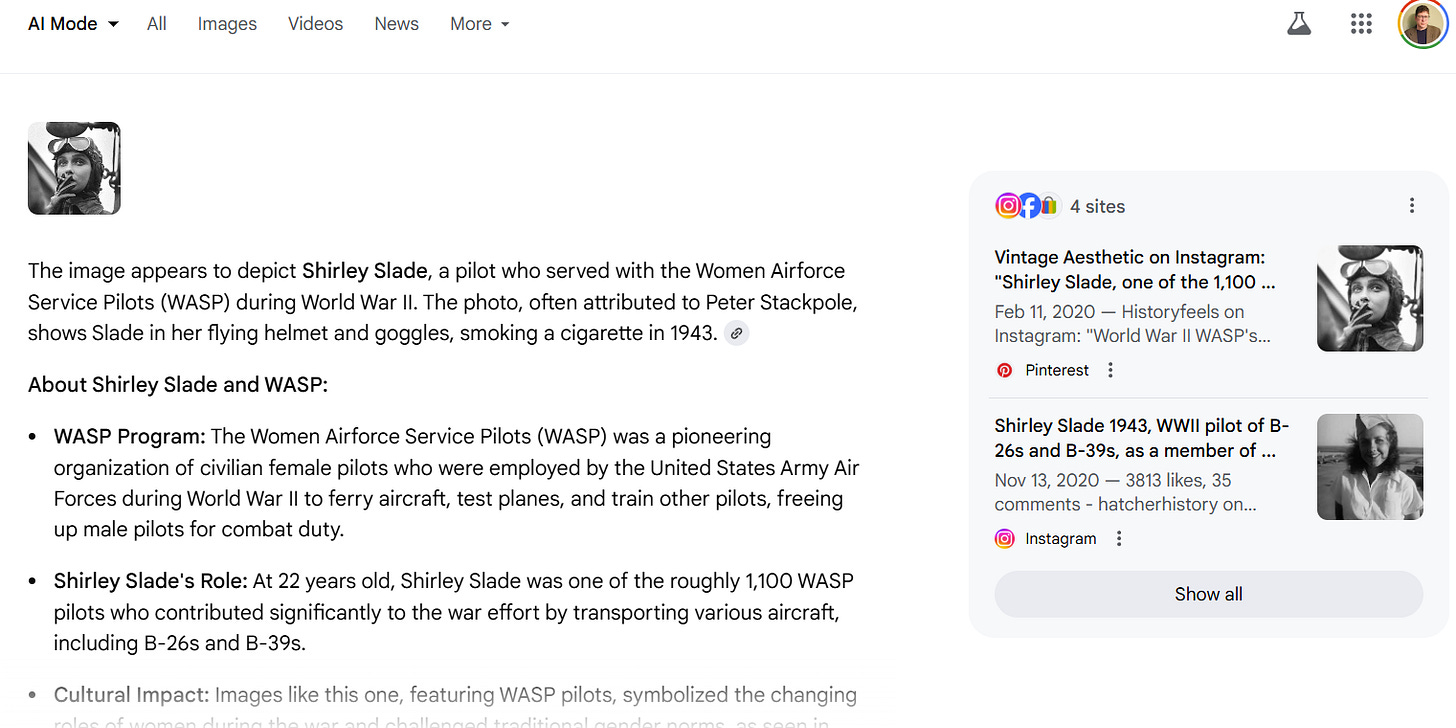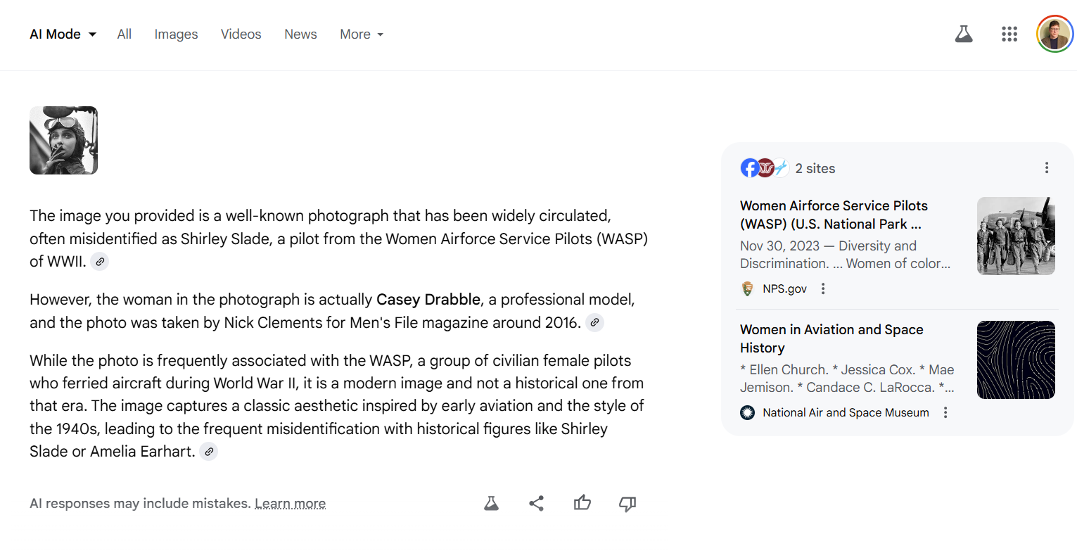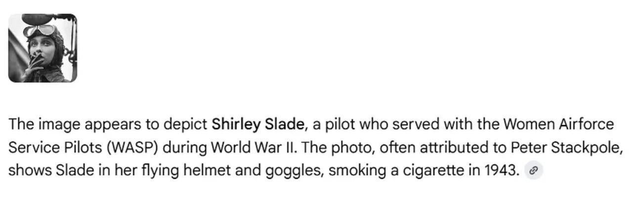 Here’s how I’d check this without an LLM. I would ignore everything but the reddit post, then click through to that. Then I would scan to see if there is an alternate theory as to who is in this picture, who took it, and when. And if I did that I’d find this: