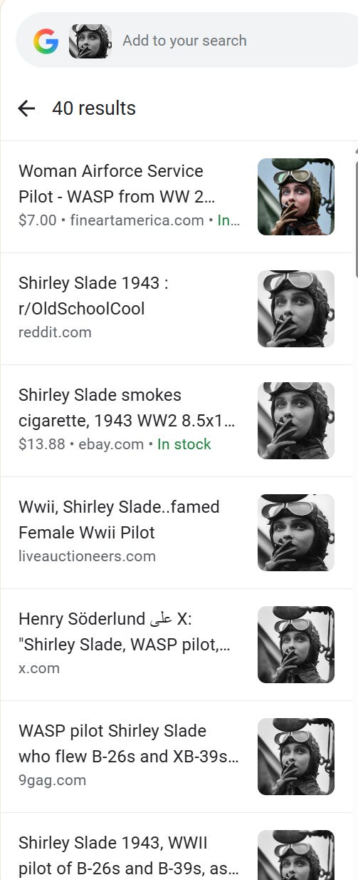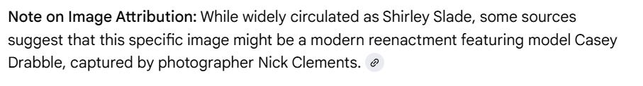 I should mention that in my educational work I find this level of skill in the untutored population (reverse image search followed by keyword scans, then iterative searching and source tracing) almost non-existent. What I am doing here is what maybe two in a hundred people would know to do. Most people would simply say — well it looks authentic. And among those who searched, most would stop at round one, believing this was confirmed as Shirley Slade. You can substantially increase these percentages by teaching people how to do this, but the untutored prevalence is very very low.