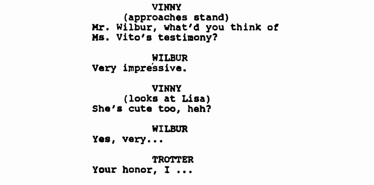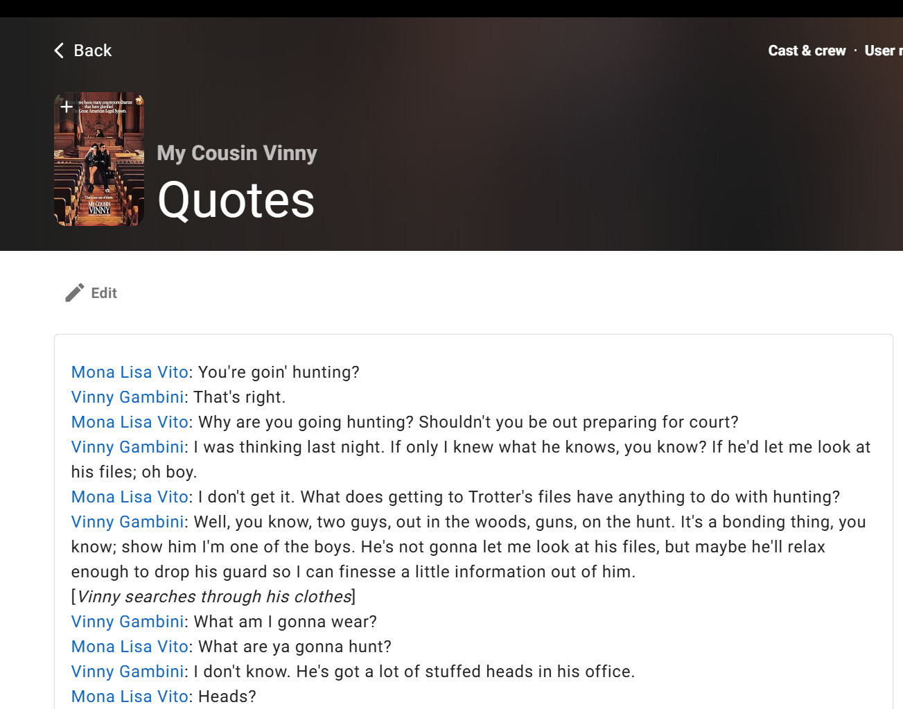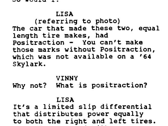 But to truly contextualize the quotes you have to weave the quotes together with the plot as described on Wikipedia and then look at people’s commentary on the quote (such as the long reddit thread walking through her limited slip differential explanation). You have to match lines to context and context to motivation. You have to get little details right. I researched this My Cousin Vinny issue for a good long time, then watched the film. And despite all that research, it wasn’t until then I noticed little things I could have known from online materials and just hadn’t put together. For example, Tomei doesn’t truly solve the case. It’s Pesci who notices the tire mark discrepancy and puts Tomei on the stand knowing that she’ll not only come to the same conclusion independently, but that she’ll bring a depth of knowledge and authority to the subject that he — with his intuition — couldn’t touch.