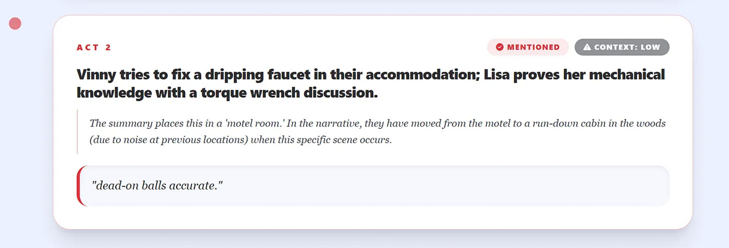 Notably, my fact-checker nearly gets there, flagging this as a context error, but puts the realization in the hotel room, not the cafe. Something for me to work on with it, maybe give it another location pass: