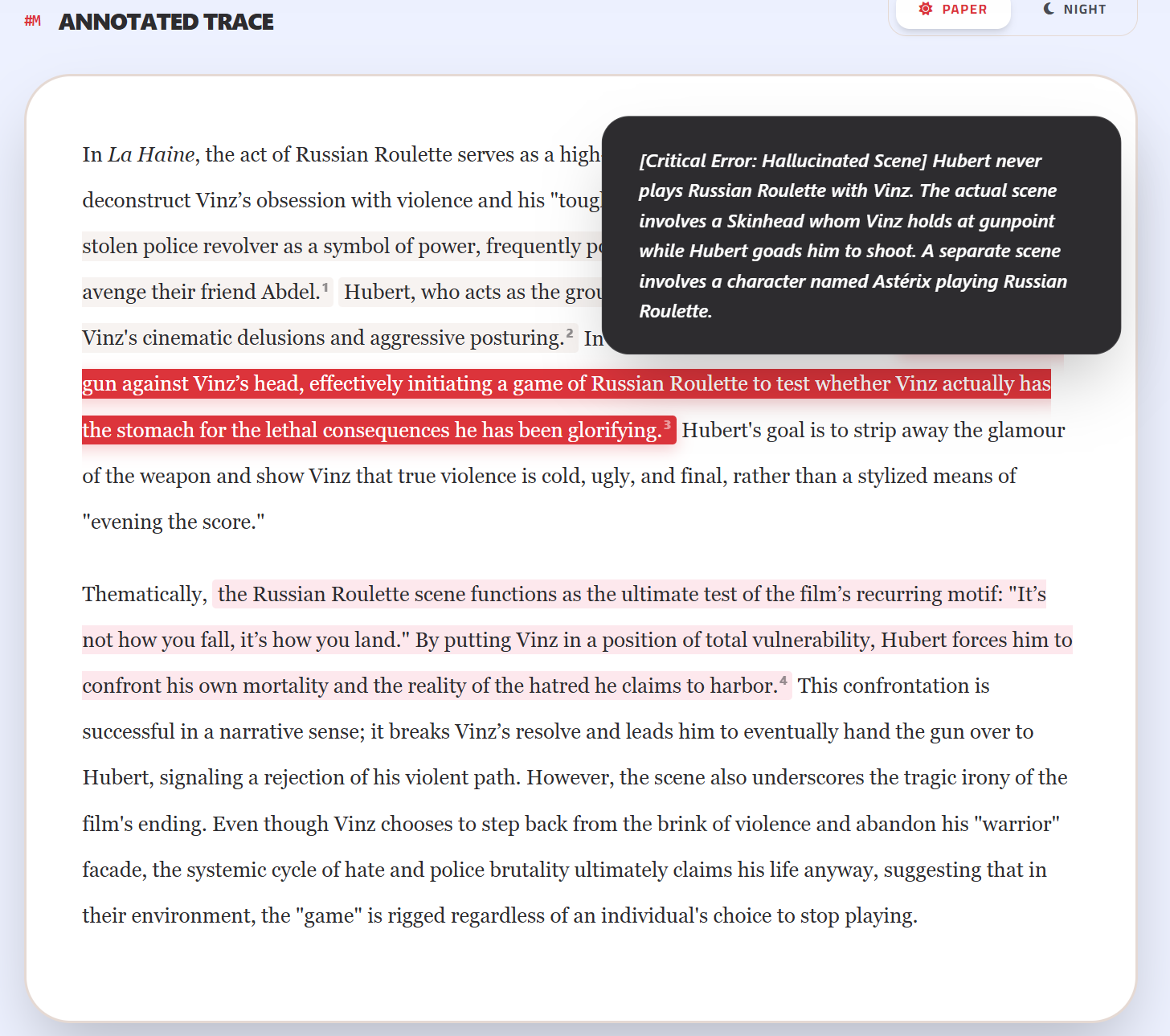 It also highlights for me the stark disconnect in perspective between people using free products that do not spend a lot of compute on reasoning and people using some of those paid products. I have to admit to being surprised by the frequency that all the free and “quick” products repeatedly confabulated scenes, lines, and even cast members, even when they were the latest models. When I talk to some very smart people about these sorts of errors I get the impression they think such errors are rare. In my experimentation with film plot summary, for instance, in asking Gemini 3.0 Flash why characters play Russian Roulette in La Haine, is it is possible to generate a near infinite amount of error in this space. Just poking around, I seldom found a question of moderate complexity that didn’t result in notable (and often critical) errors.