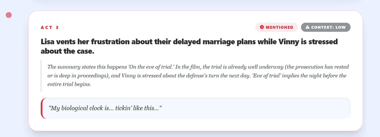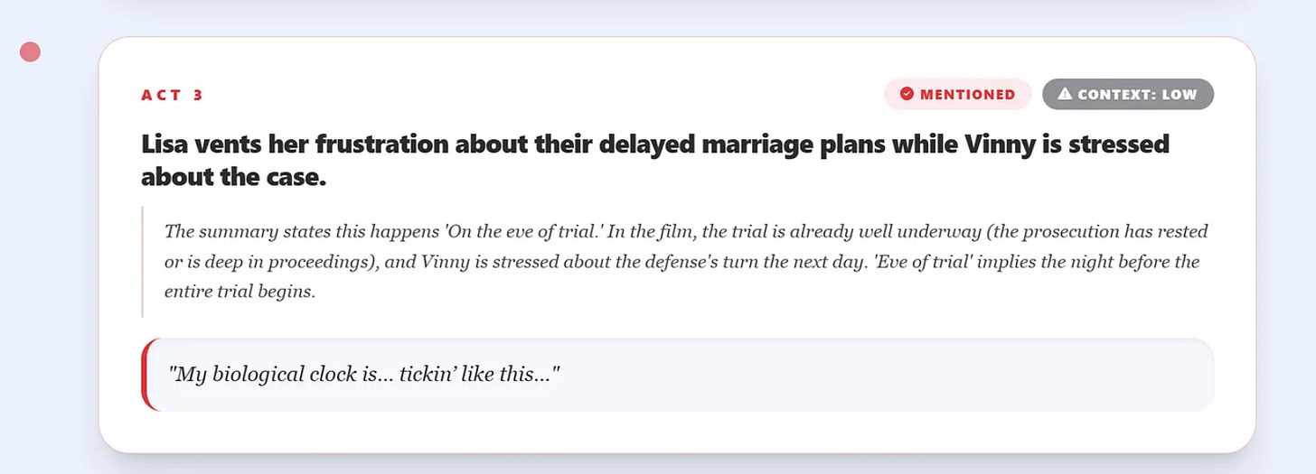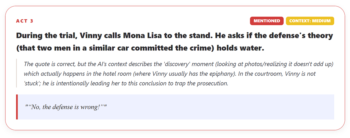 My automated fact-checker did OK on this response, but made an error or two itself. Which I find interesting. But it found two errors and one discrepancy. The big one is that the last quote about the “ridiculous thing I wore for you” is by Pesci to the judge about a second-hand suit he bought, not Lisa to Vinny. Note that it leans into tropic bias here, assuming that Pesci is embarrassed about the outfits that Lisa wears. He’s not — despite the “you stick out like a sore thumb” line, he adores her and her style,7 and I might be forgetting something but I don’t think he apologizes for her once. As a matter of fact, after she is on the stand he asks the other expert witness to confirm she’s cute: