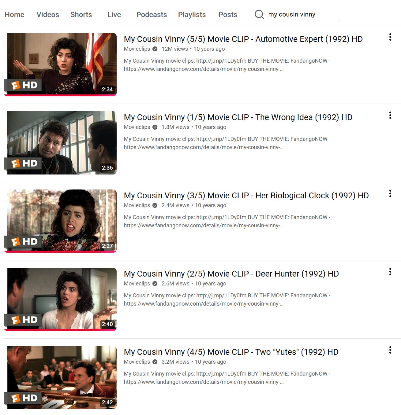 Some parts are easy. If you wanted to know what the famous lines were, we could look at the Rotten Tomatoes/Fandango YouTube clips, searching for My Cousin Vinny (incidentally as proof this is not niche, look at those view counts):
